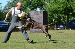 Argon begreift schnell und die Ausbildung macht ihm super Spaß. Nachdem er kurze Zeit mit seinem Herrchen als Helfer gearbeitet hat, macht jetzt wieder Thomas mit ihm Schutzdienst. Argon will bei seinem Herrchen einfach nicht vernünftig bellen. Woran das wohl liegt. Die Prüfung zur IPO 1 macht Argon im Frühjahr noch nicht. Aber bis zum Herbst wird er soweit sein. Ali dagegen ist in Rente gegangen. Übungen in der Unterordnung macht er natürlich noch und auch in der Fährte hat er mit Herrchen noch seinen Spaß, aber Prüfungen braucht er nun nicht mehr zu gehen. Mit seinen 2xBH und einer IPO VO hat er in den 3 Jahren die er nun bei uns auch viel erreicht. Er hat 3 Prüfungen mit Erfolg bestanden, dass reicht zur Rente....