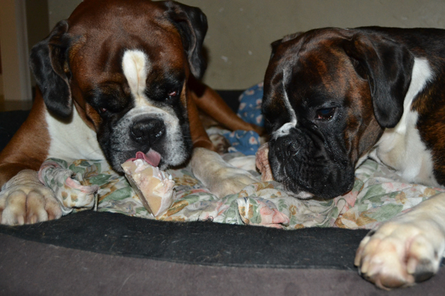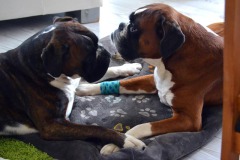 Wie in jedem Jahr gingen wir mit unseren beiden Hunden zur Routineuntersuchung zum Tierarzt. Neben den Untersuchungen rund um Herz und Kreislauf sind uns natürlich auch Ergebnisse zum Knochenbau oder zu den Zähnen wichtig. Beide Hunde zeigten sich als gesund und Argon erhielt sogar noch seine Spondylose Untersuchung, die uns im Ergebnis nicht beunruhigte sondern in unserer Arbeit mit ihm bestätigte. Aber leider wurden bei unserem Ali Wucherungen unter den Backenzähnen festgestellt. Also musste er mal wieder unter Narkose auf den OP-Tisch und es wurden ihm einige Zähne gezogen. Während der Untersuchung stellte sich heraus, dass er auch unter den Schneidezähnen I2 und I3 eine Wucherung hat. Kurzum wurden ihm dann die Schneidezähne auch noch entfernt. Wieder zuhause angekommen wurde er bestens umsorgt. Argon hat sofort die Pflege übernommen und nahm sichtlich Rücksicht auf den Großen. Mittlerweile kann Ali aber wieder toben und spielen und auch kraftvoll sein Spielzeug verteidigen.