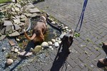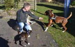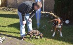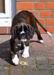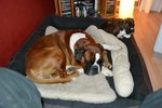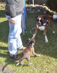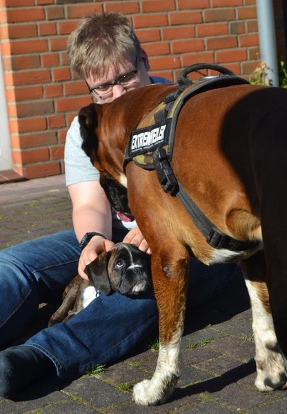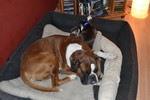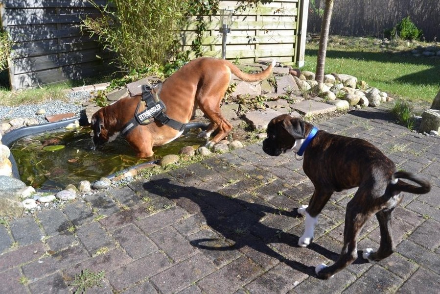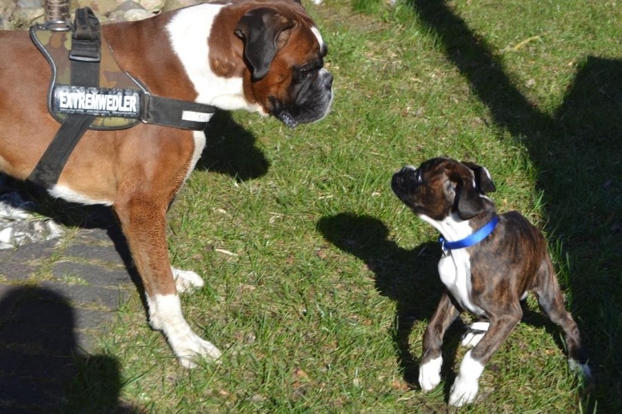 Zuhause angekommen stand uns nun der Moment der Wahrheit bevor. Unser Ali, von dem wir nicht wirklich wussten wie er einen Welcpen aufnehmen würde, sollte nuin Argon kennenlernen. Wir entschieden uns dazu die Zusammenführung auf neutralem Boden zu machen. Bei einem Spaziergang in unserer Straße sollten die Beiden sich begegnen. Es war eine sehr spannende Situation, als Frauchen nun mit Argon an der Leine um die Ecke gekommen ist. Ali wedelte, stockte, wedelte wieder und ging dann zum "Schnüffelangriff" über. Argon ergab sich sofort und suchte Deckung bei Herrchen. Aber er musste es über sich ergehen lassen, kein Schutz und schon gar kein "Nimm mich schnell auf den Arm" , half Argon an dieser Stelle. Nach einem kurzem Schnüffeln gingen wir dann gemeinsam mit beiden Hunden eine Runde durch die Straßen, bevor es in Ali´s Garten ging. Aber auch her zeigte sich Ali von seiner besten Seite und schon nach kurzer Zeit spielten beide Hunde gemeinsam im Garten, Ali zeigte seine "Waschanlage" und später dann schliefen beide in Alis Bett. Ein Stein fiel uns vom Herzen, als wir die gute erste Entwicklung sahen.
