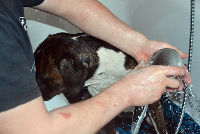 Es half nichts, bevor wir sein Ohr verarzten konnten musste er erst einmal baden. Das gefiel ihm nicht so gut aber da musste er durch. Kurzerhand ab in die Badewanne, dann mit Honigshampoo einreiben und abduschen.