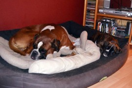 Kaum zuhause angekommen blieb nur noch der Weg ins warme Hundebett. Noch gibt sich Argon mit einer kleinen Ecke zufrieden. Mal schaun wie lange das noch so ist. Ali akzeptiert seinen neuen Mitbewohner. Sogar das zeitgleiche Fressen nebeneinander ist für die Beiden kein Problem. Es ist zu schön zu beobachten, wie auch Ali aktiv wird neben seinem kleinem Kumpel. Aber jetzt wird erstmal geschlafen.