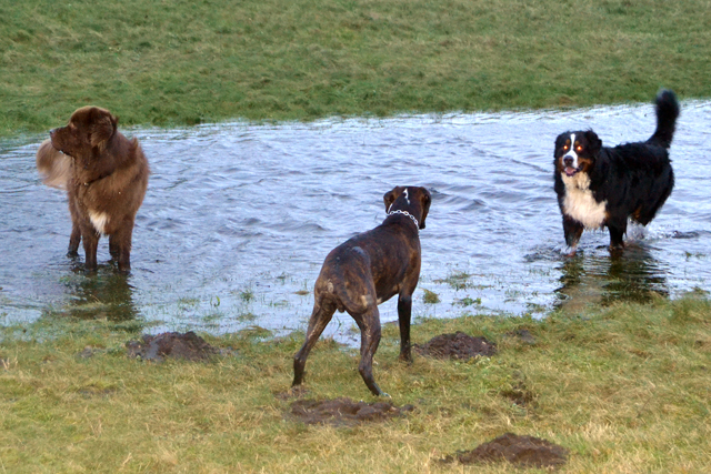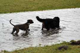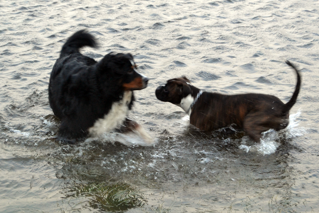 Direkt am Anfang wurden zunächst die Leinen abgenommen und die Hunde lernten sich gegenseitig kennen. Schön war dabei das urtypische Rudelverhalten zu erkennen, wenn ein neuer Hund in das Rudel gebracht wird. Viele der Hunde standen um Argon herum, der zunächst seinen Steert eingeklemmt hat und die Prozedur über sich ergehen lassen musste. Im Laufe der Zeit aber hob sich der Steert, der dann auch zu wedeln begann. Paul, ein großer Berner Sennenhund war sein ausgeblickter Verbündeter, an den er sich zu Anfang klammerte. Sogar ins Wasser ist Argon gegangen, da Paul ja auch hinein gegangen ist. Im Verlauf der ersten Runde wurde Argon immer mutiger. Immer mehr neue Freunde kreuzten seinen Weg und schnell wurde er dann auch zum spielerisch gejagten. Insgesamt ein total toller Tag und endlich haben wir eine Beschäftigung gefunden, bei der Argon mal bis an seine Leistungsgrenze gebracht wird. Zuhause angekommen fiel Argon nur noch in sein Bett und verschlief beinahe sein Abendbrot.